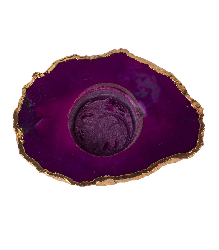 A thick rough-cut deep pink agate stone, with space for a tealight, carved out makes for the deep Garnet tea light holder. Agates are natural stones with such beautiful self patterns within that they come under the semi-precious stone category. We plate the edges on the agate in gold